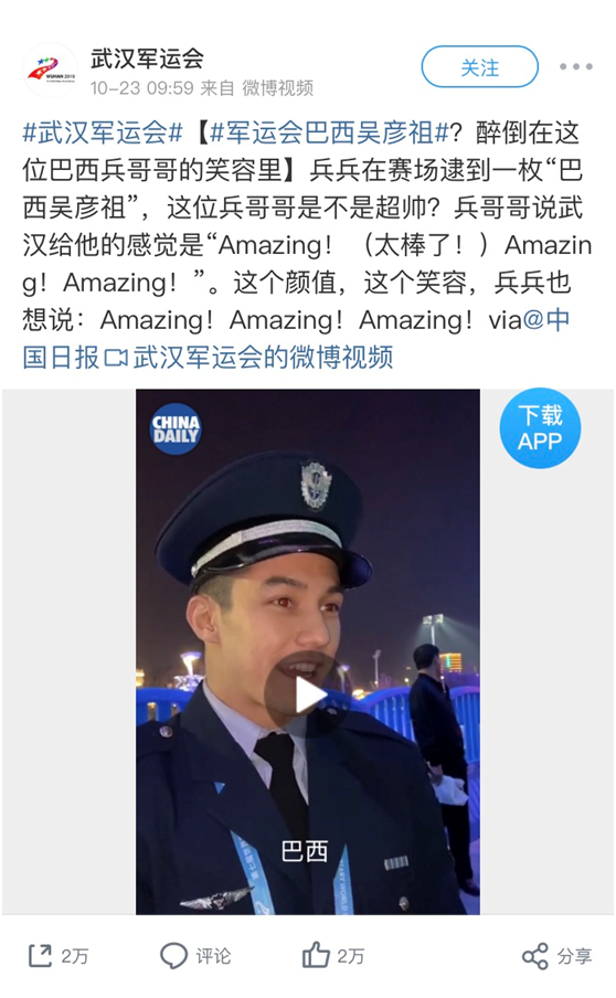 这条热搜源于23日上午本届世界军人运动会官方微博@武汉军运会 转发的一段视频,视频中接受采访的正是这名代表巴西前来武汉参赛的兵哥哥,因为笑起来酷似吴彦祖迅速走红网络,还被网友“宠溺地”称为“巴西吴彦祖”。