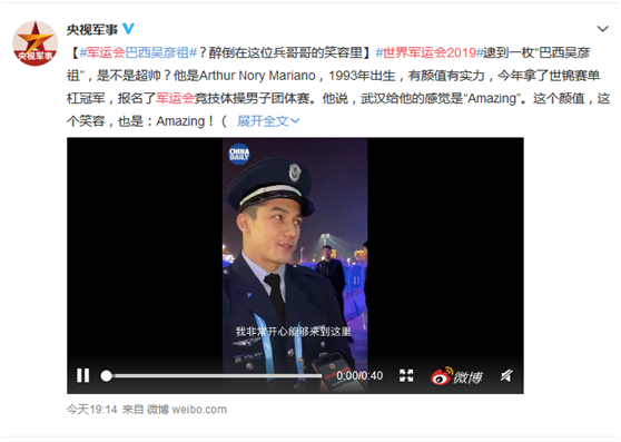 今天稍晚时候,央视军事频道官方微博也转发了这一视频,顺便科普了一番:“他是Arthur Nory Mariano,1993年出生,有颜值有实力,今年拿了世锦赛单杠冠军,报名了军运会竞技体操男子团体赛。”↓