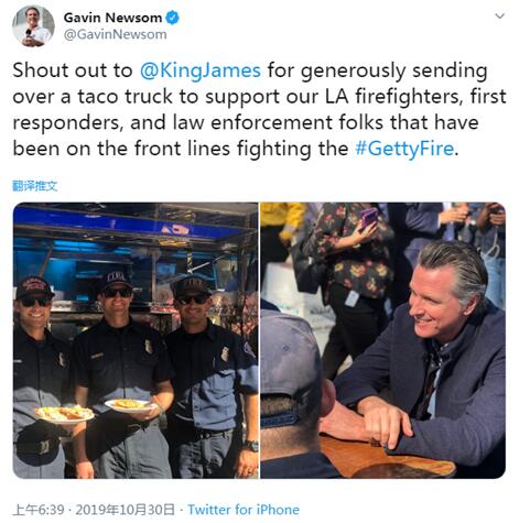 “对@KingJames慷慨送一卡车墨西哥玉米饼支援在一线与盖蒂大火抗争的洛杉矶消防员,应急人员和执法人员。”