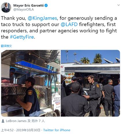 “谢谢你,@KingJames,慷慨地给我们@LAFD(洛杉矶消防局)的消防员、应急人员和一同抗击#盖蒂大火的合作伙伴们派来了一辆炸玉米饼大卡车。”