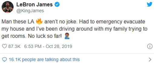 其实,詹姆斯本人就是加州大火的“受害者”。当地时间28日凌晨,詹姆斯发推,称自己不得不紧急撤离另找地方居住,并感叹“洛杉矶大火真不是闹着玩的”。↓