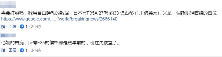 甚至有网友引用绿媒的数据直接反驳:日本买27架F35A,约花费1.1亿美元。这位网友还批评,台空军司令部又是一个睁眼说瞎话的单位!