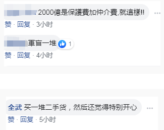 除此之外,还有不少网友讽刺台空军司令部这种睁眼说瞎话的辩解行为。有人说,美方就是把库存倒给台湾还收最贵的费用,“叽叽歪歪解释什么东西?”