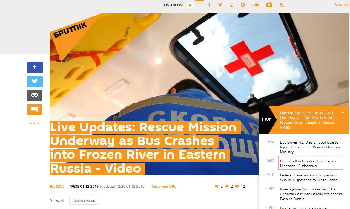 【环球网报道 记者 侯佳欣】据俄罗斯卫星通讯社最新消息,当地时间12月1日,俄外贝加尔边疆区内,一辆大巴车驶经坤加河(Kuenga River)流域时不慎从6米高的桥上坠落,目前已造成19人死亡,18人受伤。