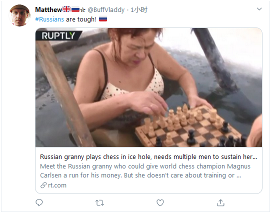 据RT介绍,普什卡列娃来自俄罗斯车里雅宾斯克,那里的居民被称作“俄罗斯最硬核的人”,而普什卡列娃在冰窟窿里下棋的爱好再次印证了这样的说法。