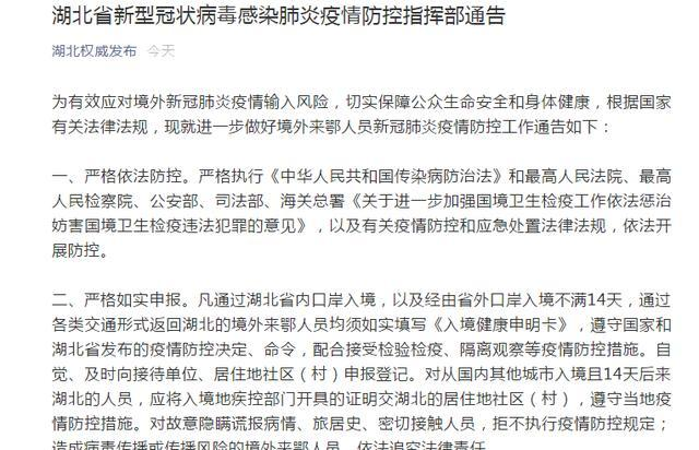 湖北:湖北省新型冠状病毒感染肺炎疫情防控指挥部3月17日发布通告,称对境外来鄂人员中确诊病例(含无症状感染者)、疑似病例、不能排除感染可能的发热患者、密切接触者四类人员,一律按防控规定就地进行分类处置;对所有其他境外来鄂人员,一律由各市州组织“点对点”接返和集中隔离医学观察14天;隔离期间食宿费用原则上由个人自理。有特殊情况的,经严格评估,可进行居家隔离医学观察。所有境外来鄂人员一律纳入当地社区(村)疫情防控体系。确诊病例已参加基本医疗保险的,在基本医保、大病保险、医疗救助等按规定支付医疗费用后,个人负担部分财政给予补助。确诊病例中未参加基本医保的,医疗费用原则上由个人负担;经认定的困难人员,所发生的医疗费用,按照传染病防治法等法律法规的相关规定,给予医疗救助。