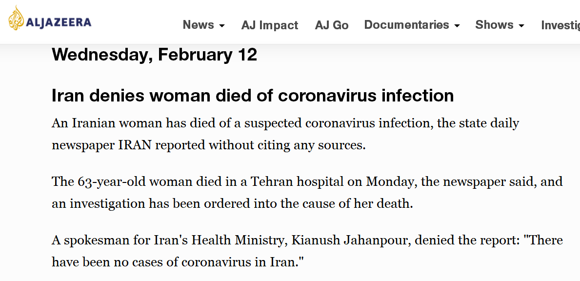 伊朗卫生部发言人贾汉普尔(Kianush Jahanpour)否认了该报道:“伊朗没有出现新冠肺炎病例。”