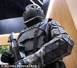 他的手臂上覆盖着有迷彩图案的织物,并由标有俄罗斯国旗的装甲钢板保护着。他穿着一双滑雪靴般笨重的鞋,腰上包裹着一个金属框架。