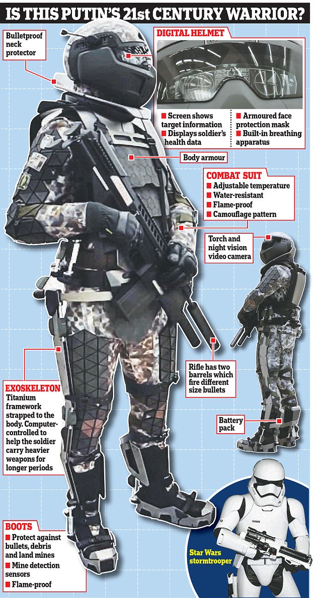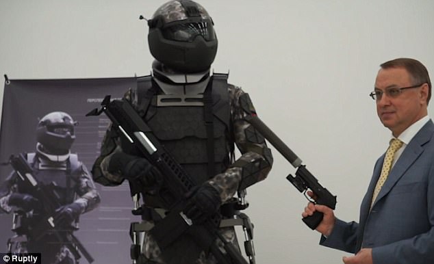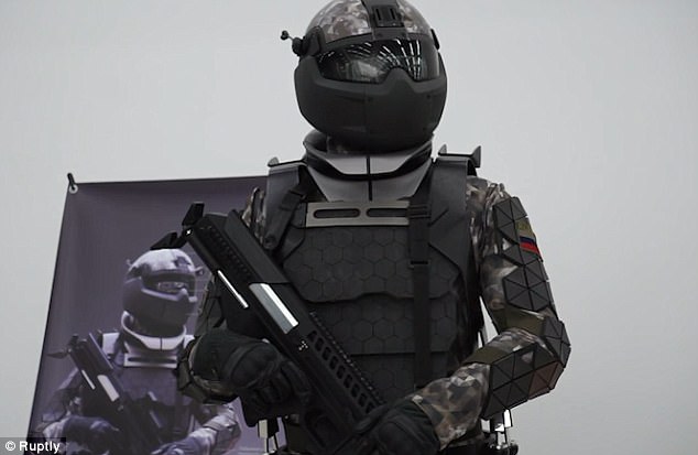 另一款军用外骨骼由莫斯科的武器发展中心——精密机器制造中央研究所发明。用来展示这款外骨骼的模特身高超过六英尺(约1.8米),戴着一副黑色软垫手套,手持一支令人生畏的手枪。