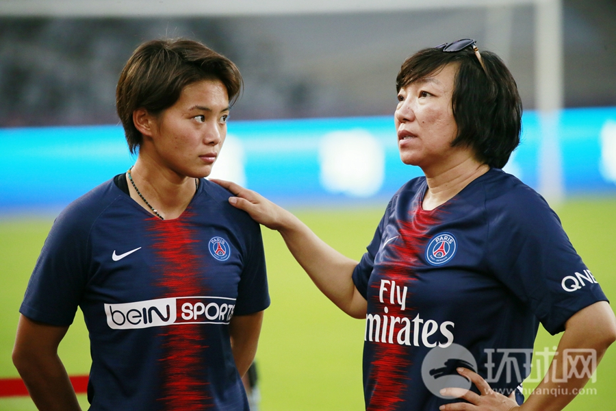 2018年8月3日 深圳大运体育场 法国超级杯巴黎圣日耳曼赛前训练 中国女足前国脚孙雯与刚刚加盟巴黎圣日耳曼女足的现役国脚王霜出现在训练现场。(摄影:李昊)