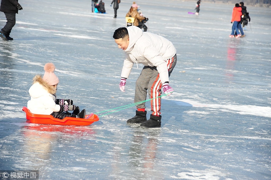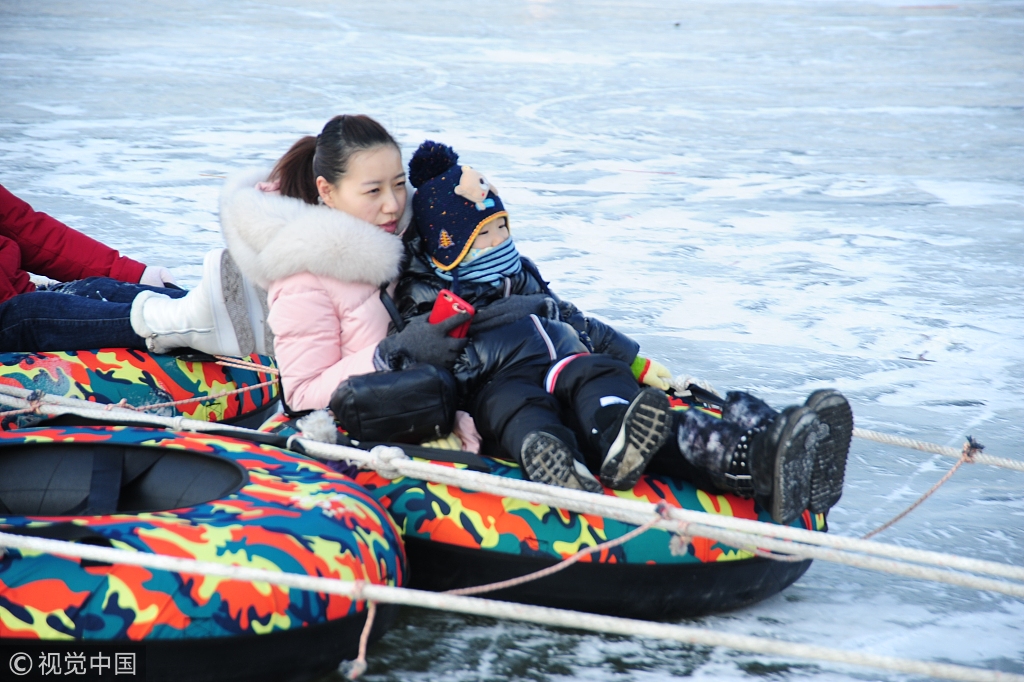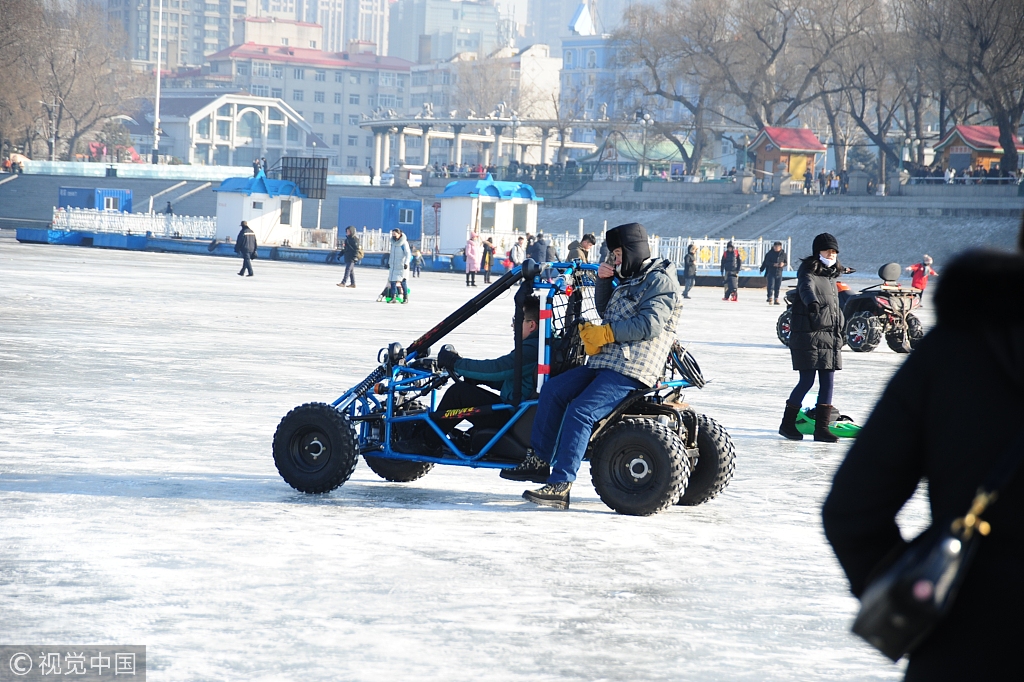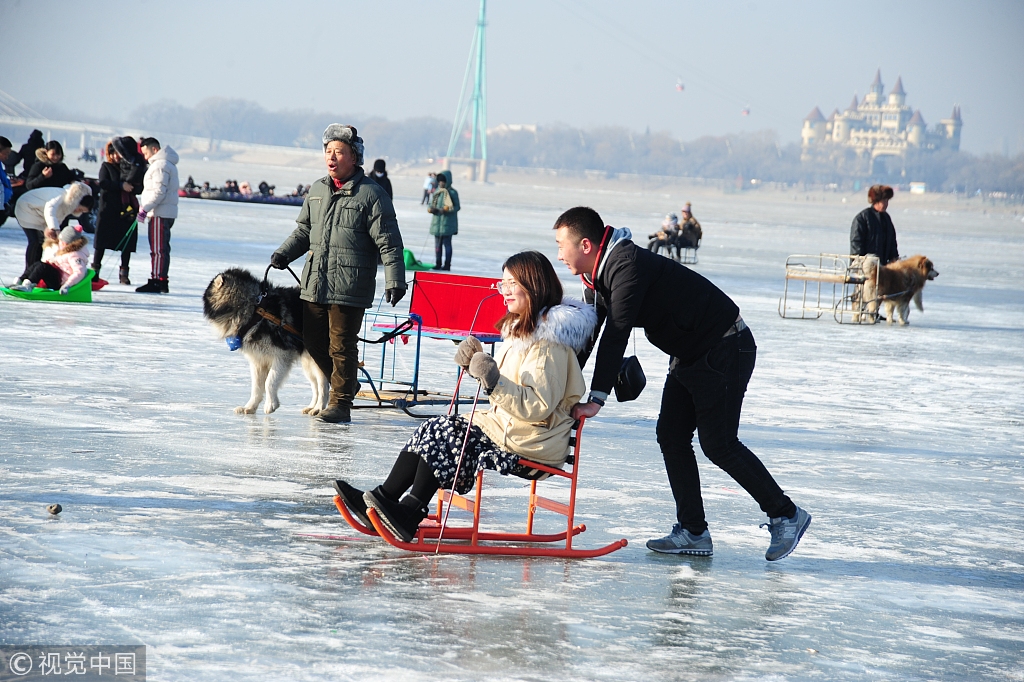 2018年12月16日,哈尔滨市道里区松花江面上,数千游客在冰面上畅玩各种游乐项目。狗拉爬犁、雪圈漂移、雪地车等各种冰上游戏让游客们玩得兴高采烈,流连忘返。小刘/视觉中国