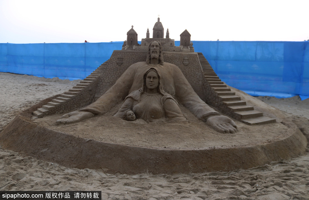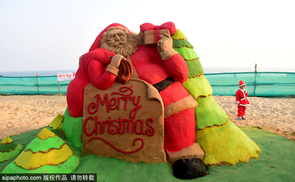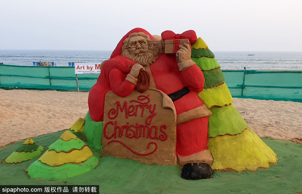 这个圣诞老人位于孟加拉湾的东海岸海滩,游客可以在2108年12月25日的圣诞节欣赏。(图源:希帕中国)