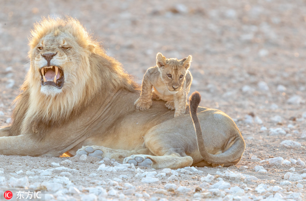 2019年1月3日报道(具体拍摄时间不详),摄影师Jason Kandume在非洲纳米比亚埃托沙国家公园拍摄到一组狮子一家三口生活照。照片中,一头小狮崽跟随着狮爸狮妈在野外游荡,顽皮成性的它还爬上爸爸的背玩耍,把狮爸弄得龇牙咧嘴很是烦躁的样子。看着顽皮成性的孩子,狮妈也免不了告诫狮爸好好教育自己的儿子。