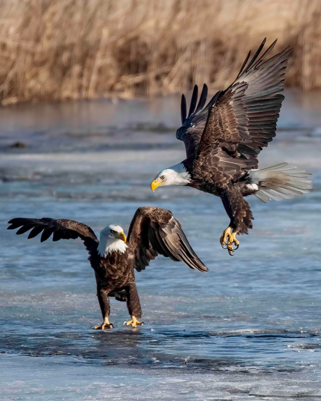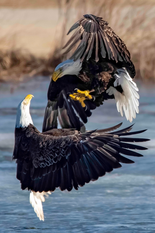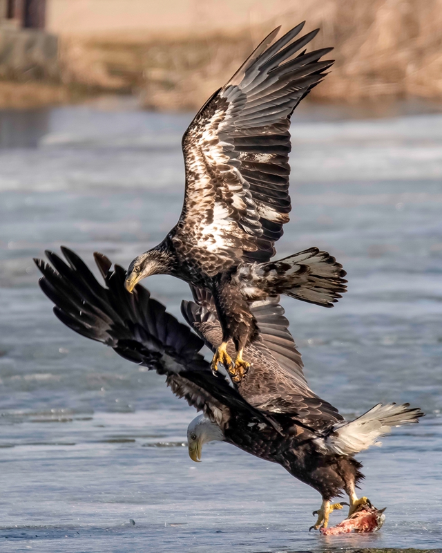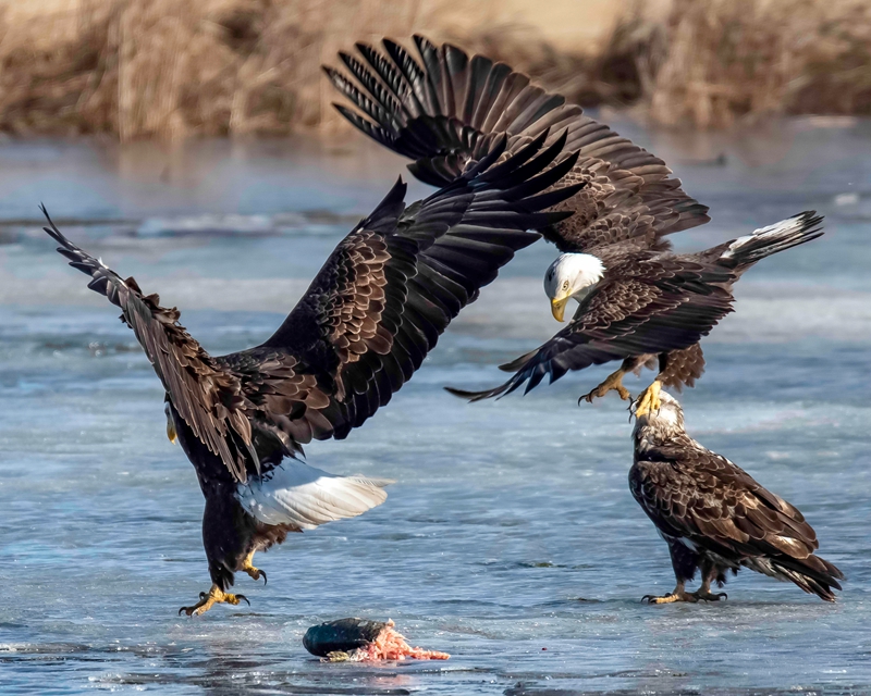 2019年5月21日报道,这组镜头完美地呈现了老鹰抢食时史诗般的“开撕”画面。 55岁的摄影师Myles Newberry 在位于美国伊利诺伊州富尔顿( Fulton )的上密西西比野生动物保护区游览时,偶遇到这场精彩的战斗。据Myles介绍,有大量的雄鹰会在寒冬期间聚集在大坝的开阔水域,等待着春季迁徙的鱼儿,当天气转暖,河冰开始破裂,老鹰和其他鸟类就会开始抓鱼。在这组画面中可以看到,其中一只鹰发现了一条大鲤鱼,还没嘚瑟几秒,立刻被警觉的同伴发现,扭打成一团抢鱼,最终,几只老鹰都分得了部分鱼儿。