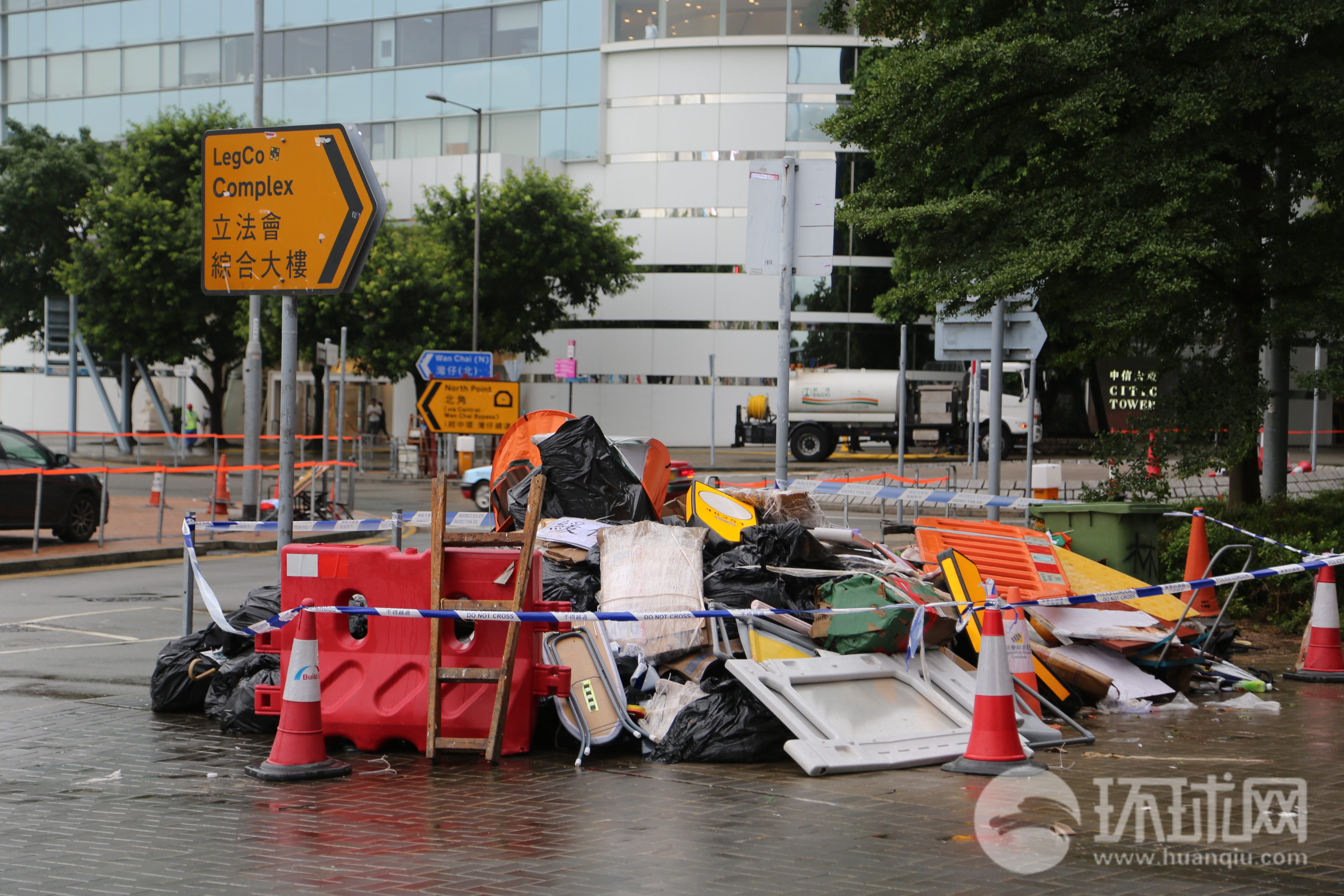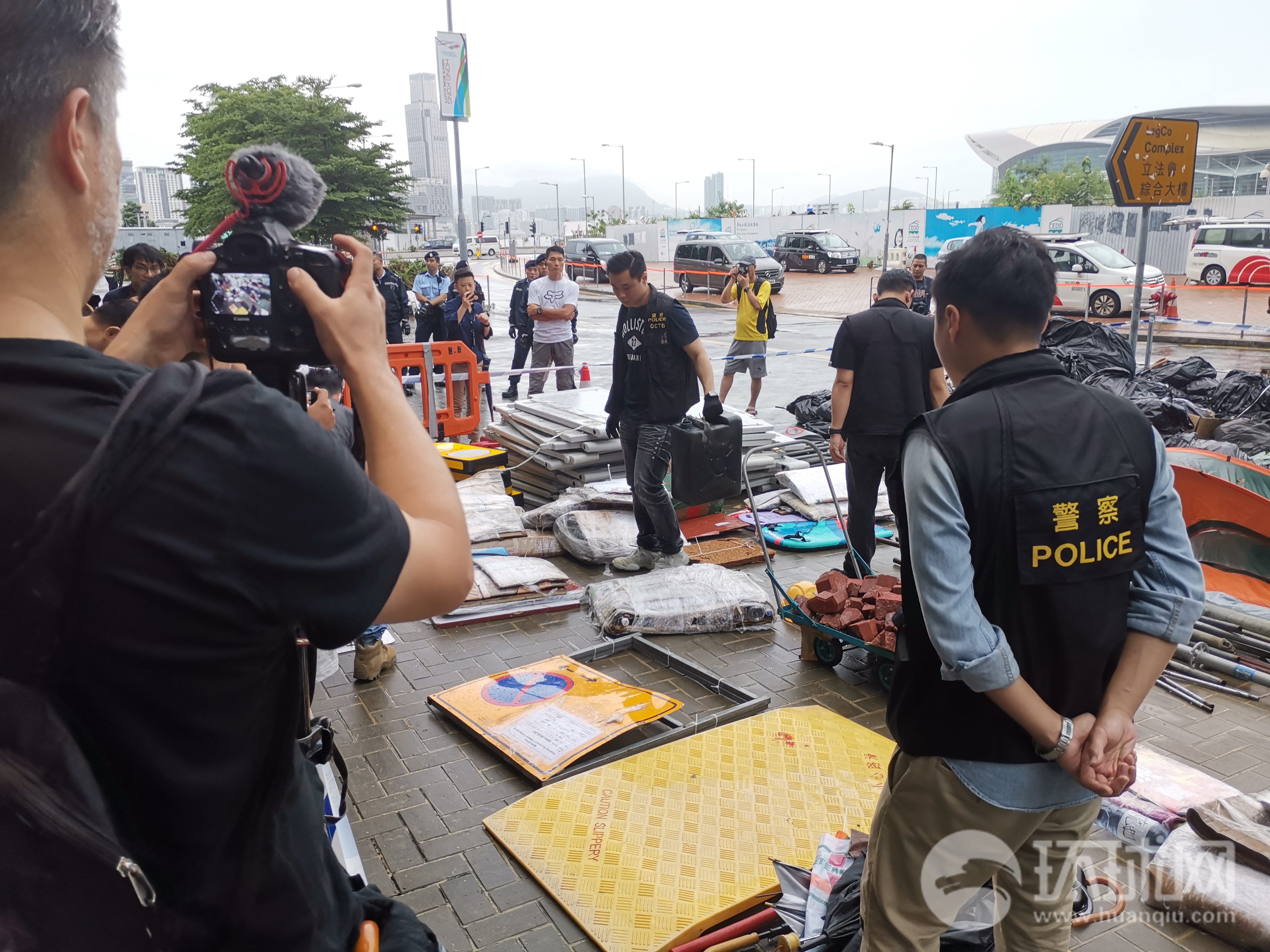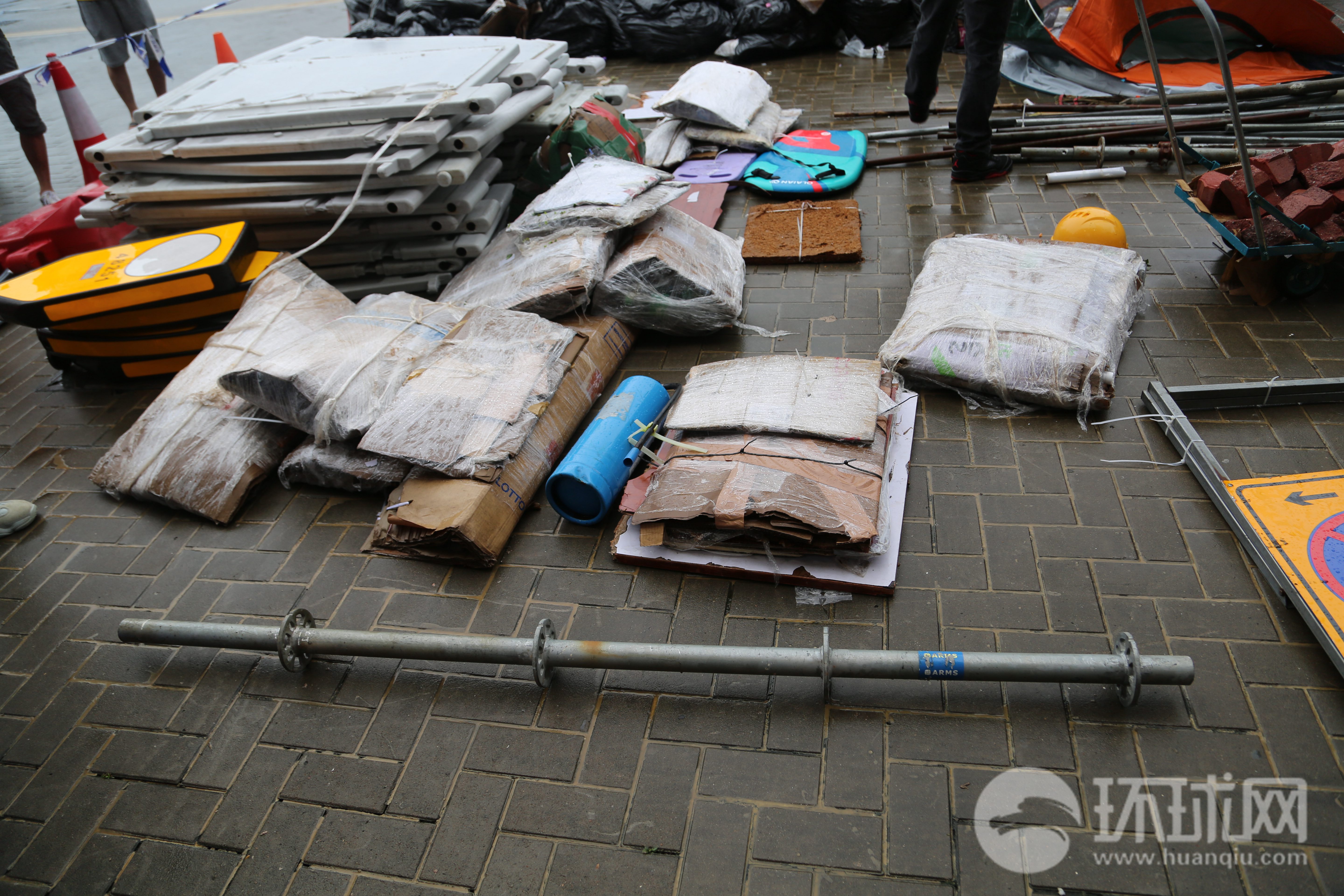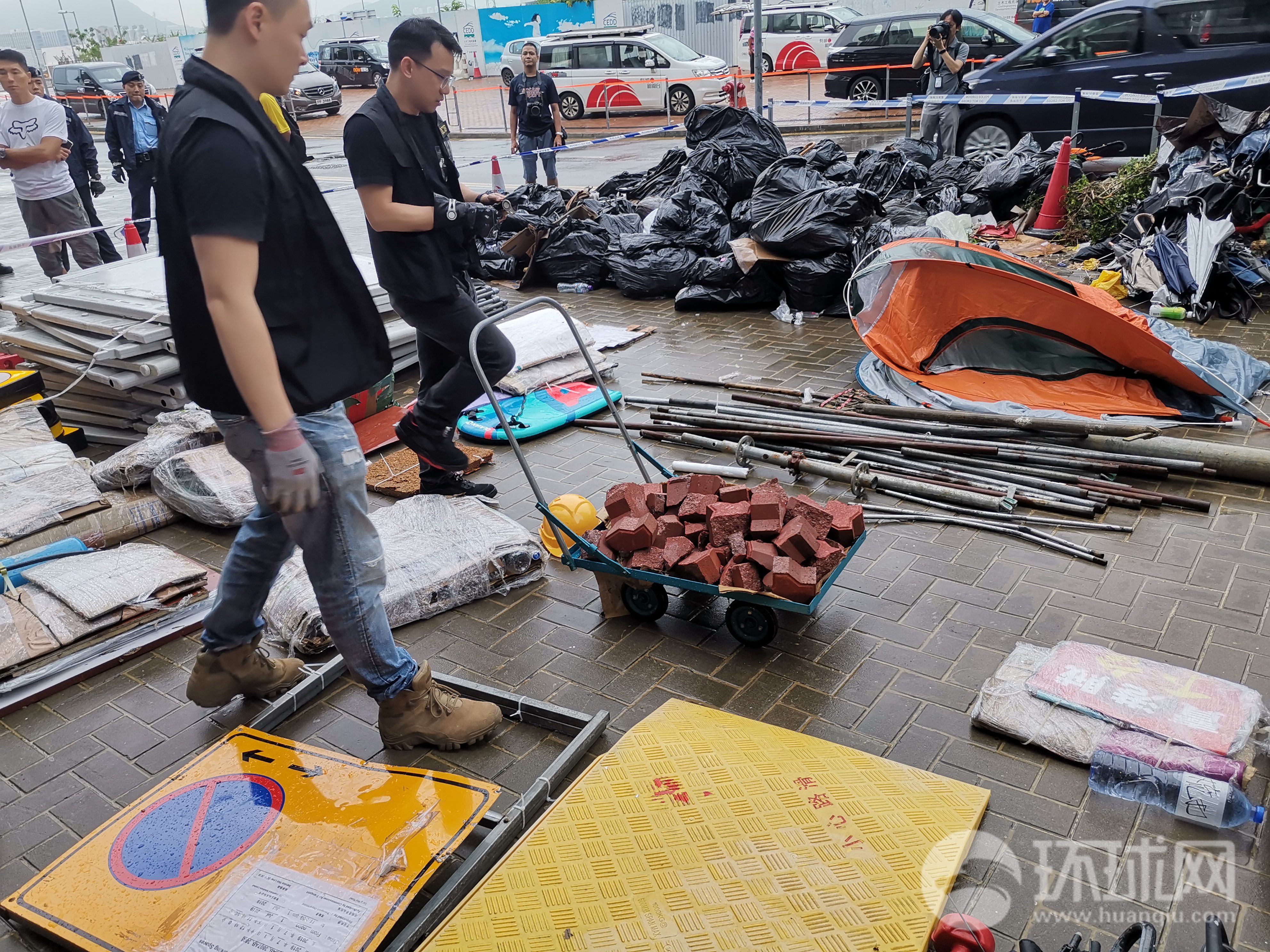 【环球时报-环球网综合报道 记者 杨升 陈青青】香港警察今天在处理从立法会清理暴力冲击香港立法会的示威者之前留在立法会内部的杂物和作案工具,工人在用木板修补被砸坏的玻璃外墙。暴力冲击的作案工具包括从附近工地或建筑里拆卸出来的铁棍,脚手架,地砖,雨伞等,有知情人告知冲击立法会的示威者当晚的作案工具都是就地取材。