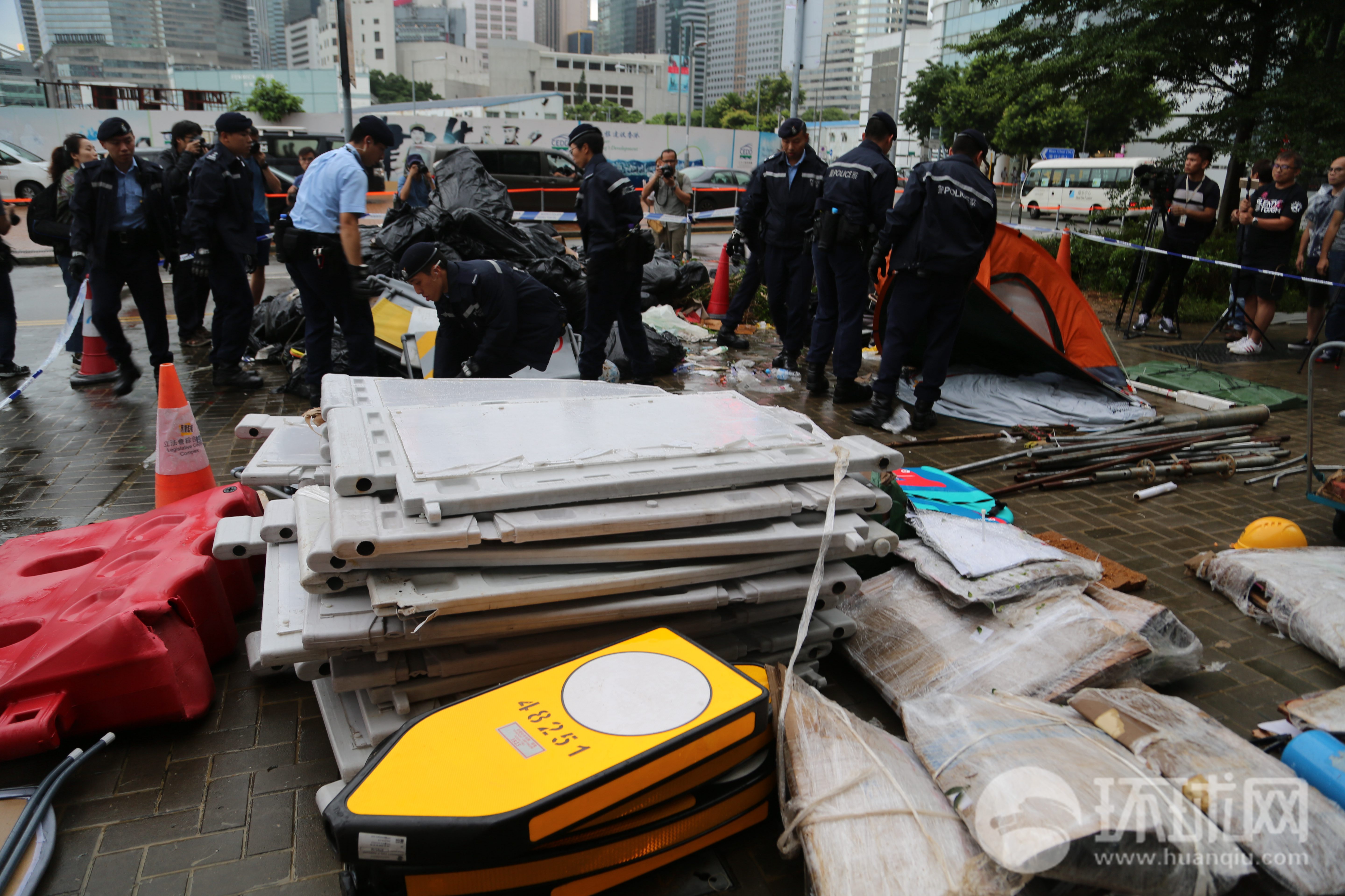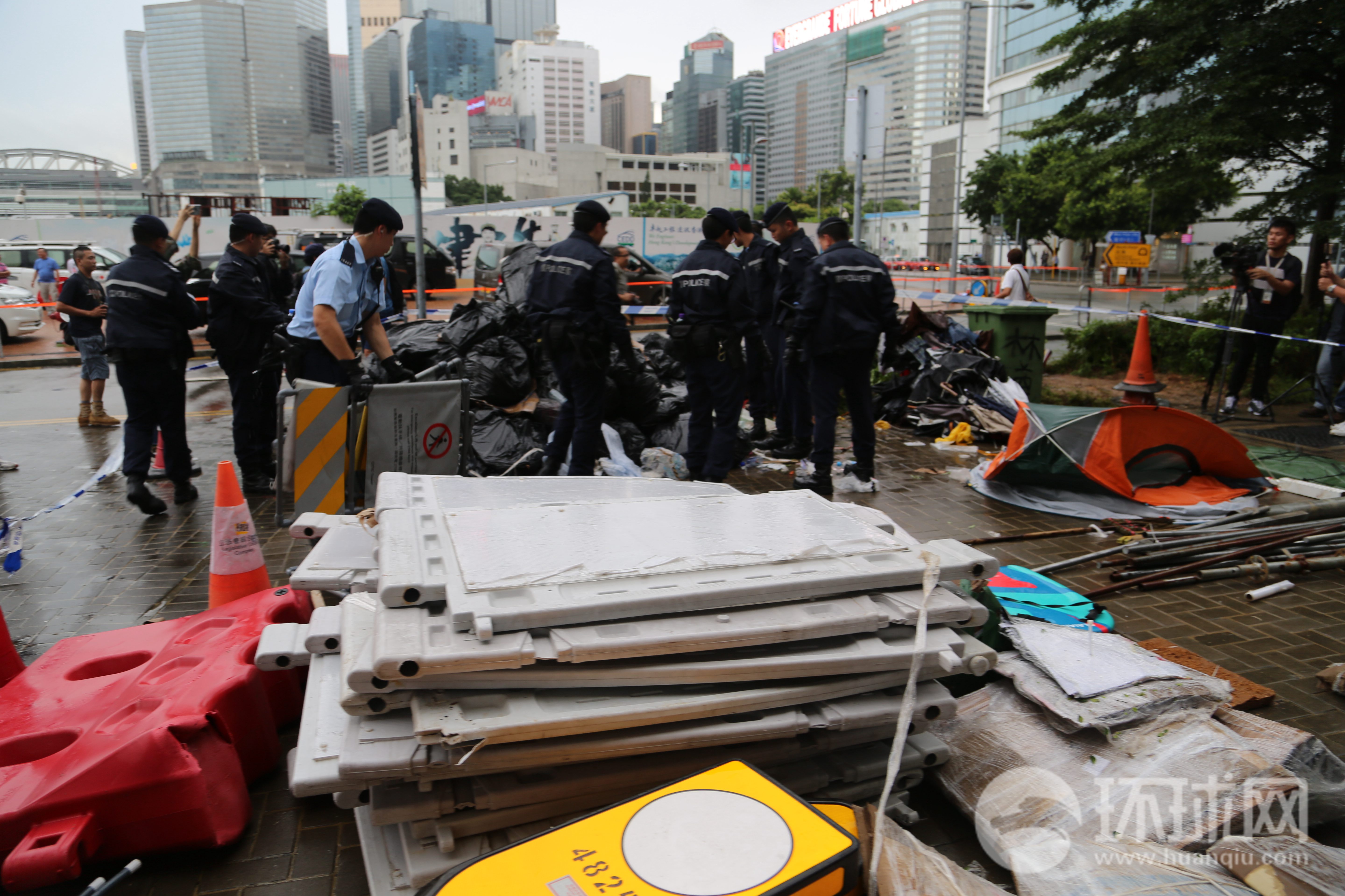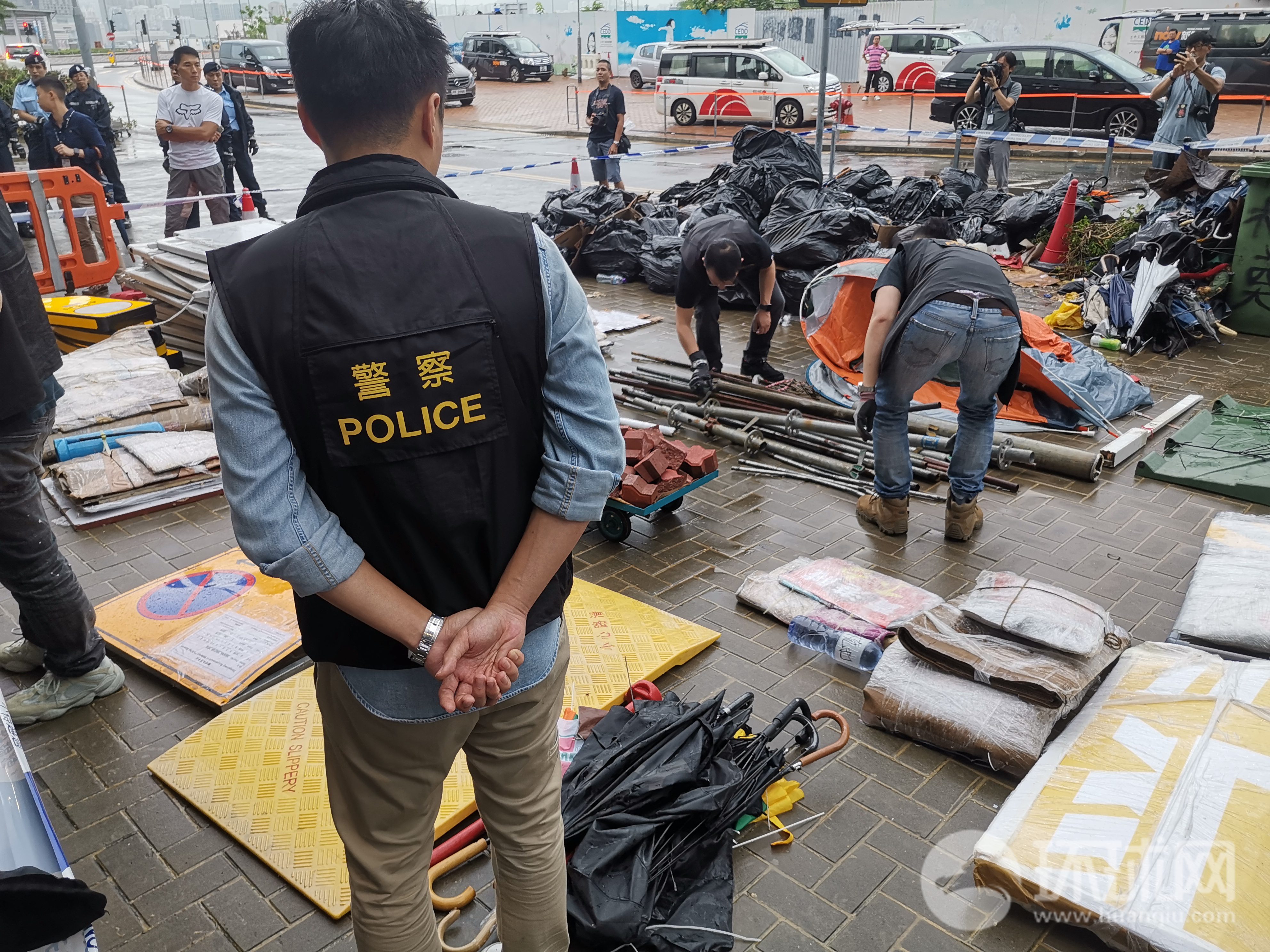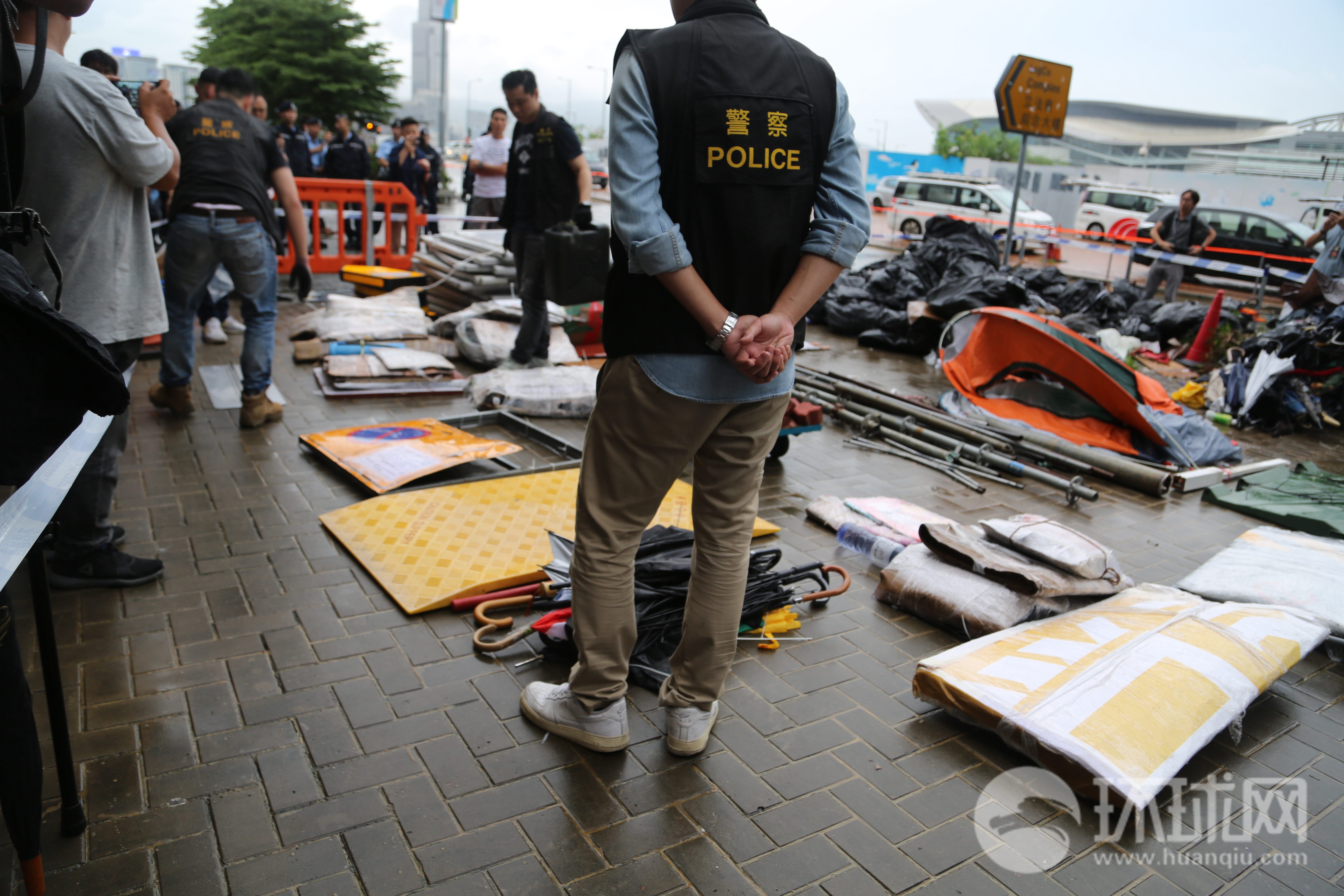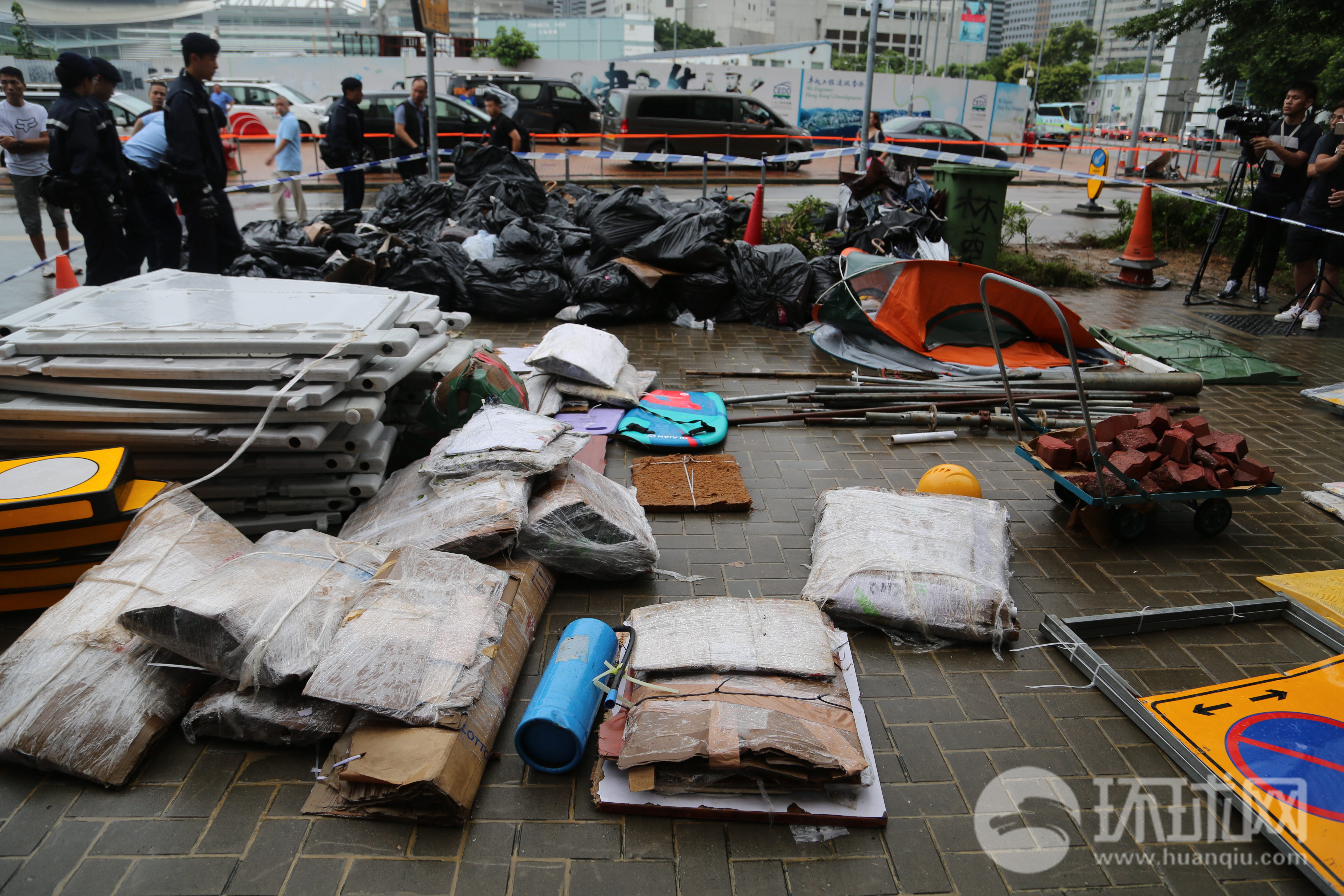 【环球时报-环球网综合报道 记者 杨升 陈青青】香港警察今天在处理从立法会清理暴力冲击香港立法会的示威者之前留在立法会内部的杂物和作案工具,工人在用木板修补被砸坏的玻璃外墙。暴力冲击的作案工具包括从附近工地或建筑里拆卸出来的铁棍,脚手架,地砖,雨伞等,有知情人告知冲击立法会的示威者当晚的作案工具都是就地取材。