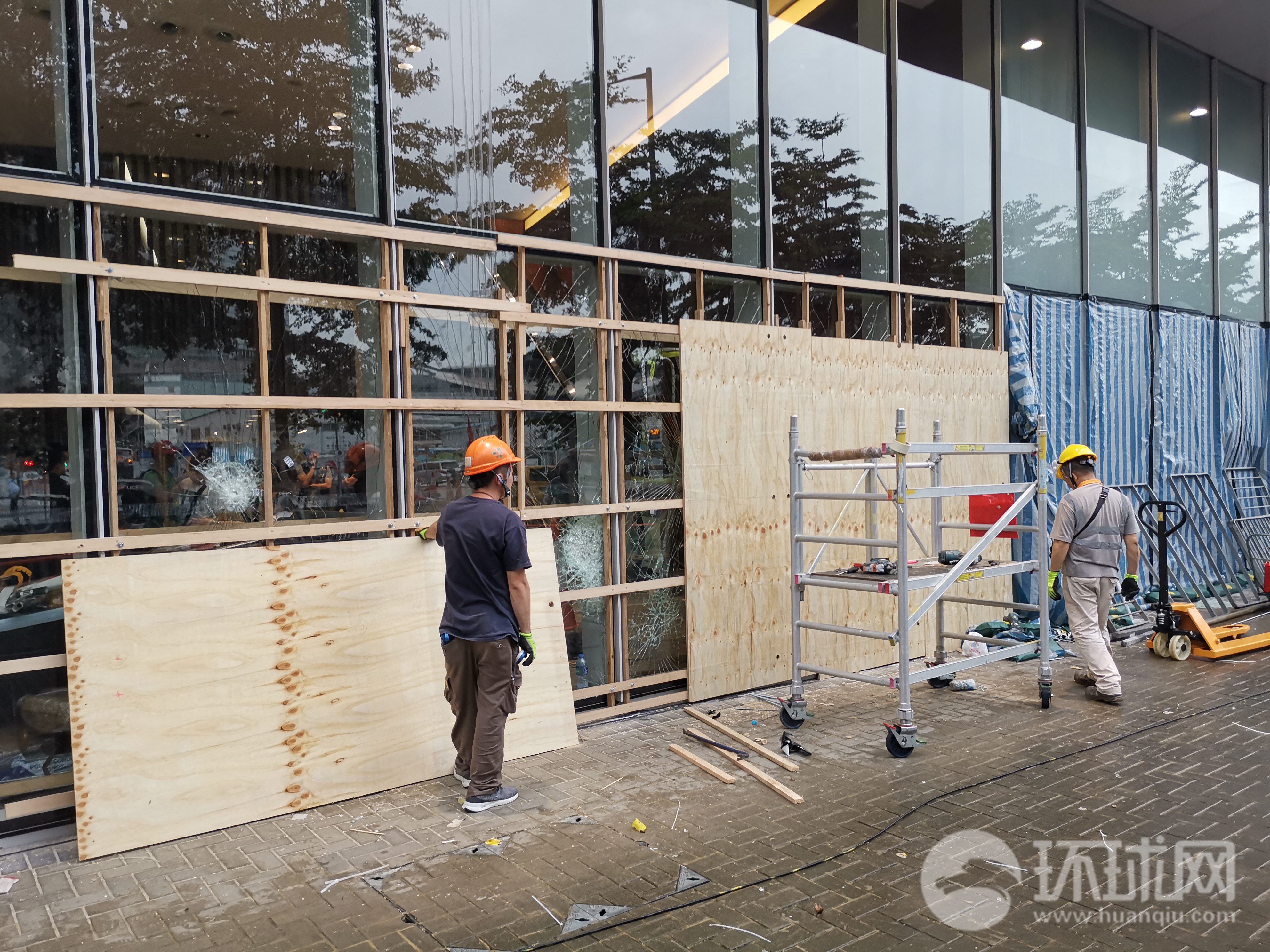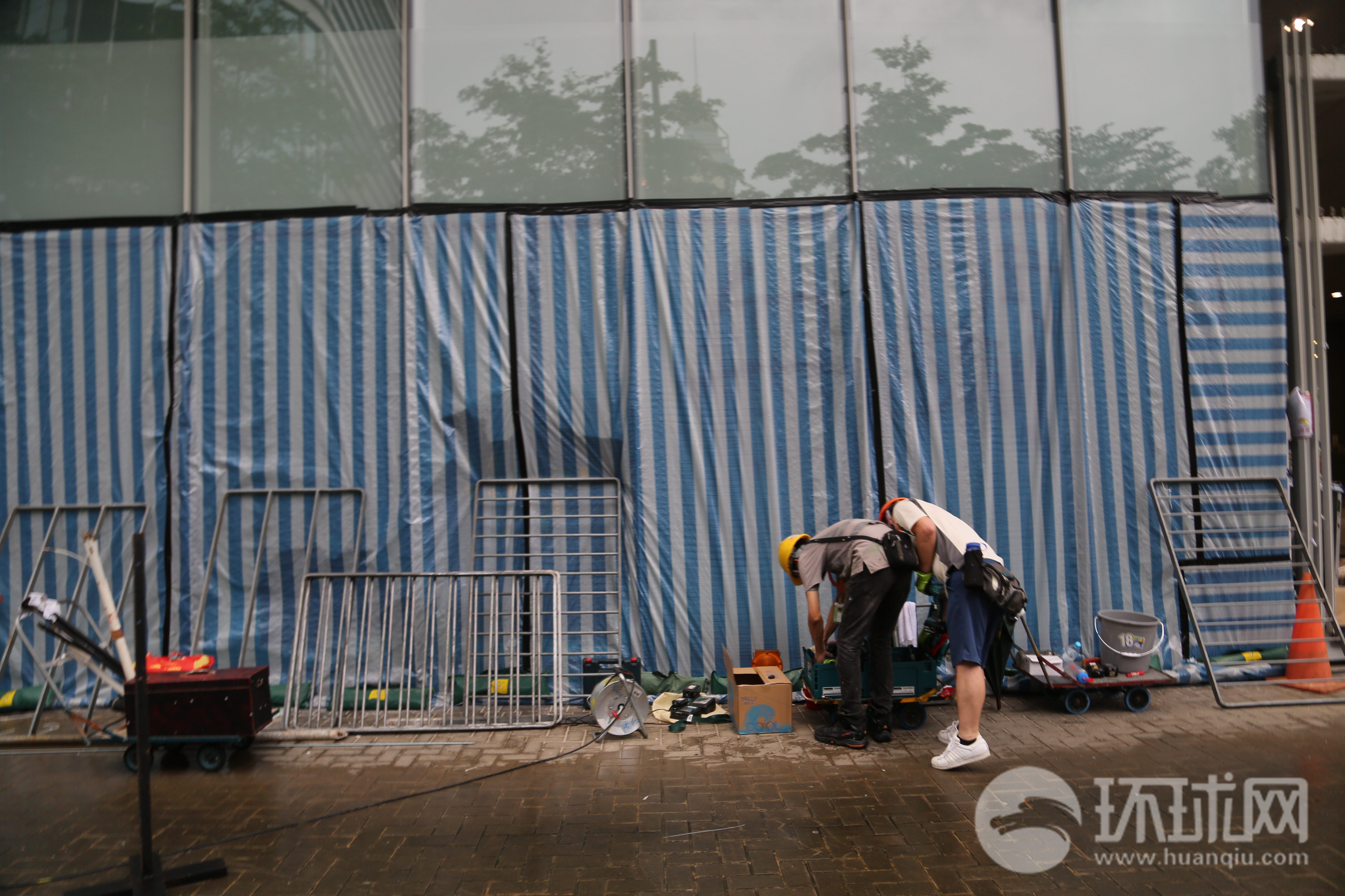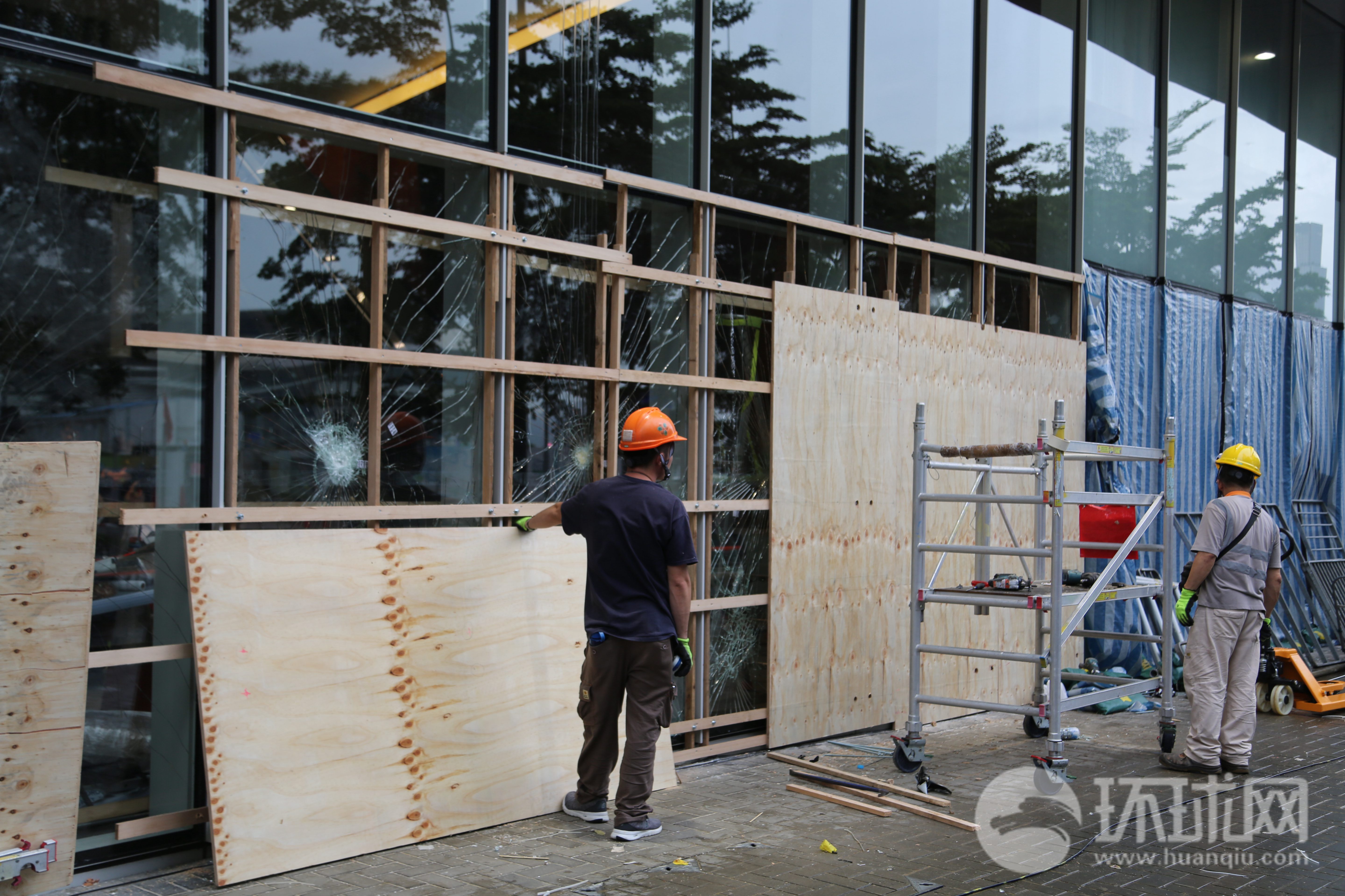 【环球时报-环球网综合报道 记者 杨升 陈青青】香港警察今天在处理从立法会清理暴力冲击香港立法会的示威者之前留在立法会内部的杂物和作案工具,工人在用木板修补被砸坏的玻璃外墙。