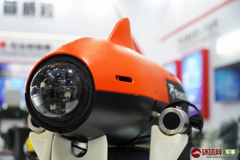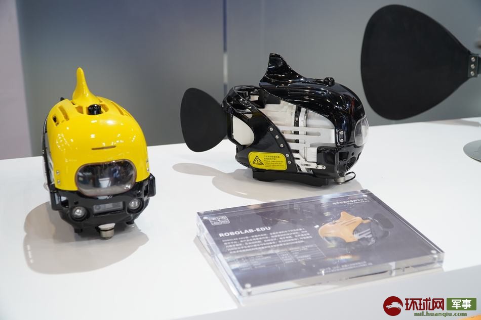 现场展出的混合动力水下机器人平台,采用仿生鱼尾和无刷螺旋桨混合动力驱动,可根据任务需求搭载不同的外部设备。