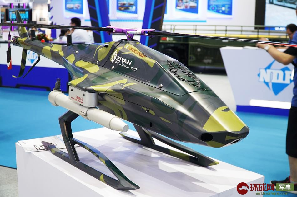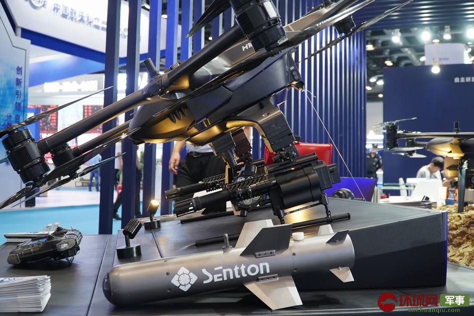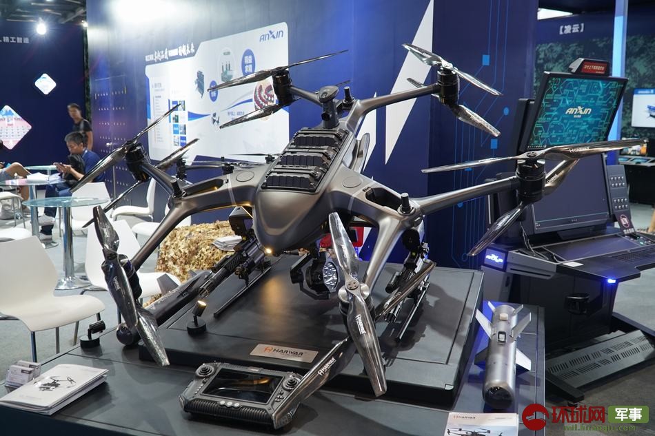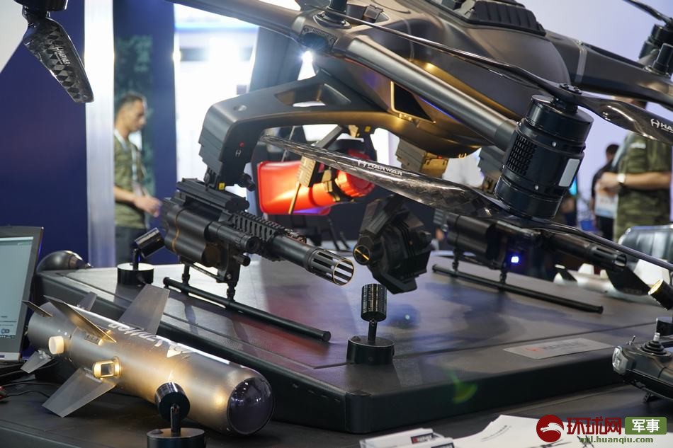 参展的哈瓦“战斧H16”多旋翼特种装备无人机。这款无人机外形上看上去相当彪悍,虽然是多旋翼无人机平台,却搭载了相当强大的火力配置。