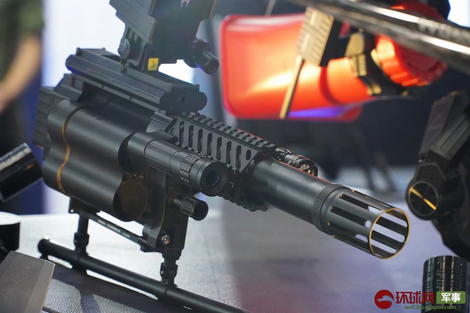 展出的这架“战斧H16”无人机装备了高空发射枪模块,每挺发射枪能够连打5发38毫米口径爆震弹、催泪弹、烟幕弹或是子母弹。