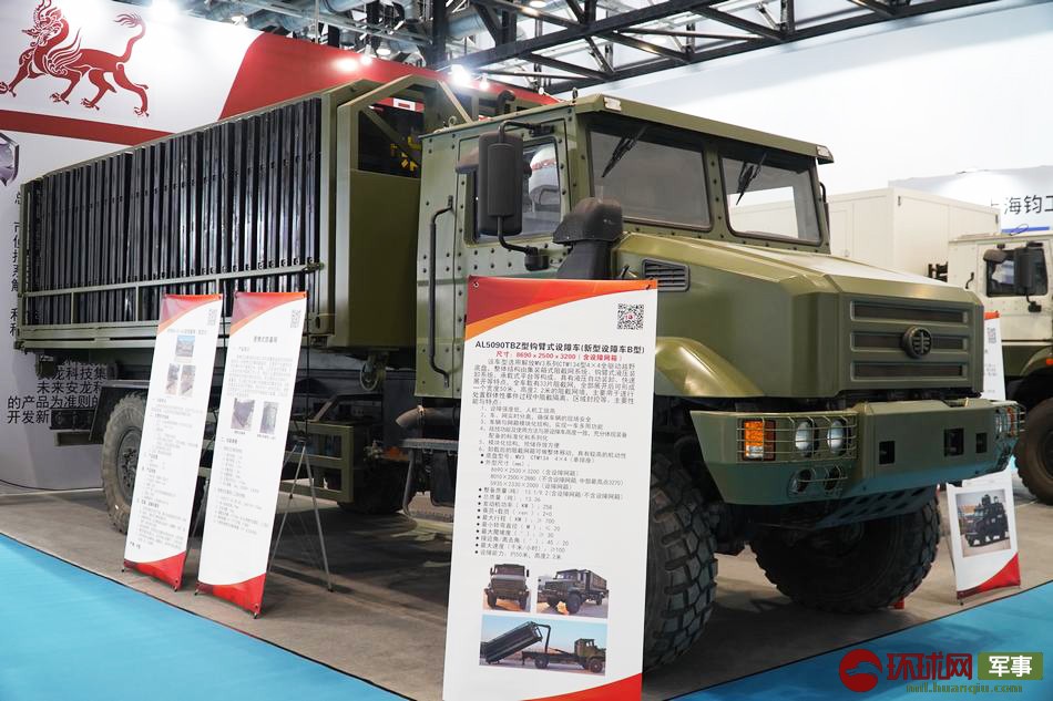 现场展出的钩臂式设障车,该车展开后能形成一个宽度50米、高度2.2米的阻截网墙。