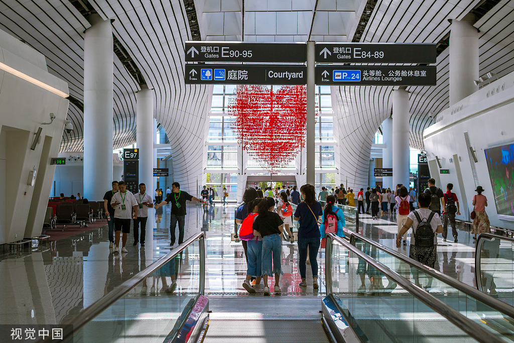 2019年8月30日,北京大兴国际机场举行投运前最大规模综合演练——第五次综合演练,共有8868名模拟旅客、140架次航班参加。图片来源:视觉中国