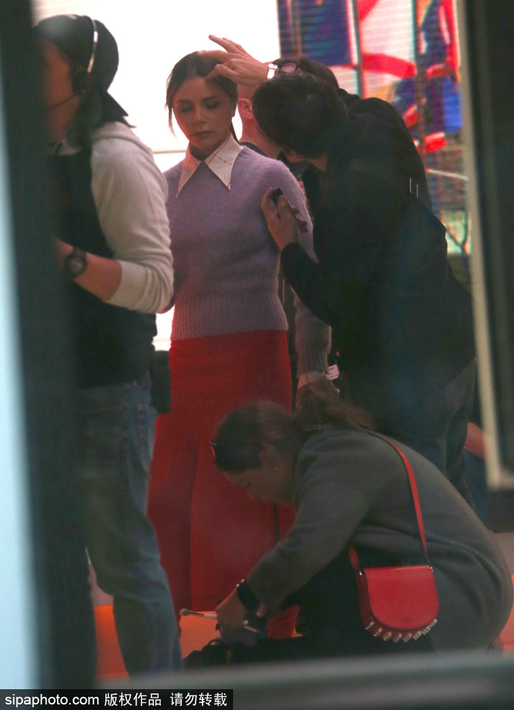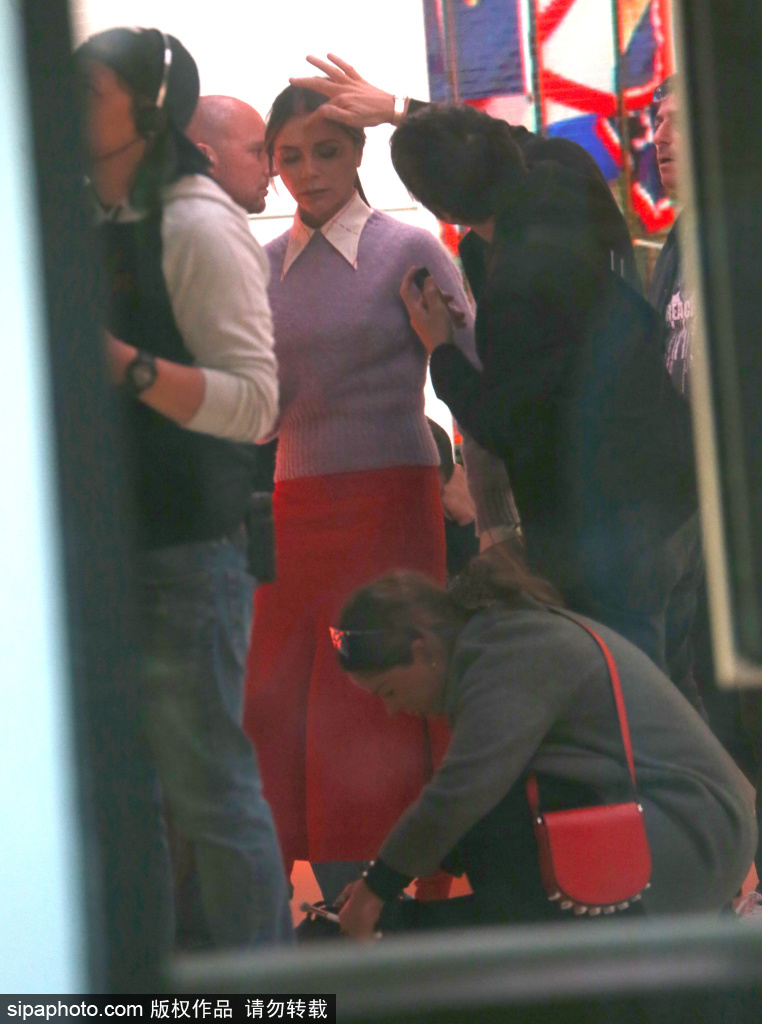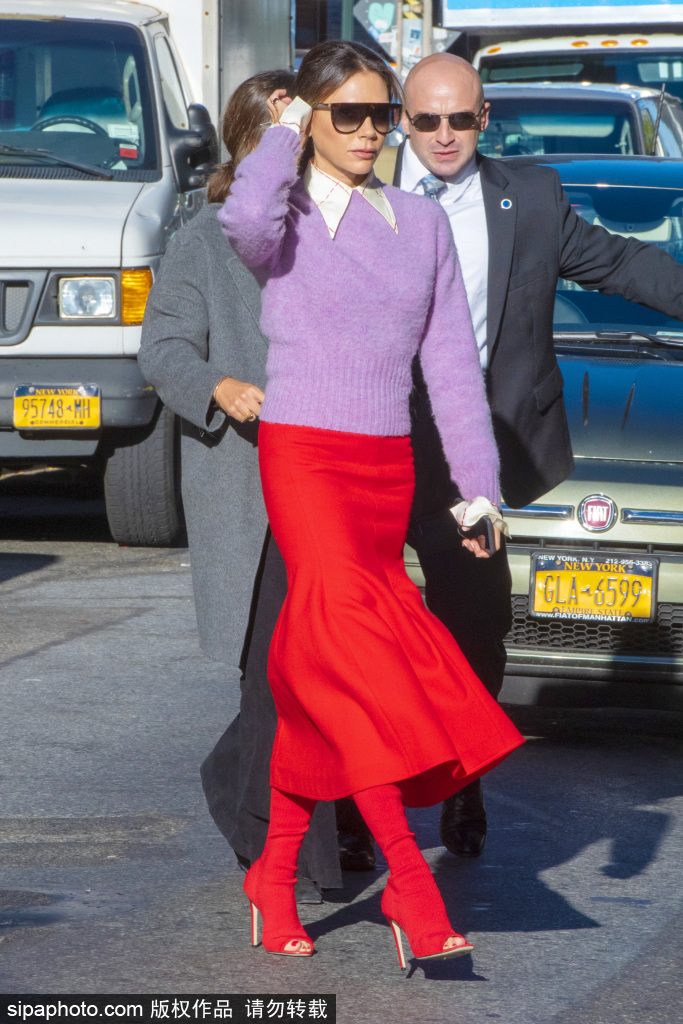 【环球网时尚综合报道】 风姿绰约!“贝嫂”维多利亚·贝克汉姆身穿紫毛衣搭配红裙前往电视台拍摄“今日秀”