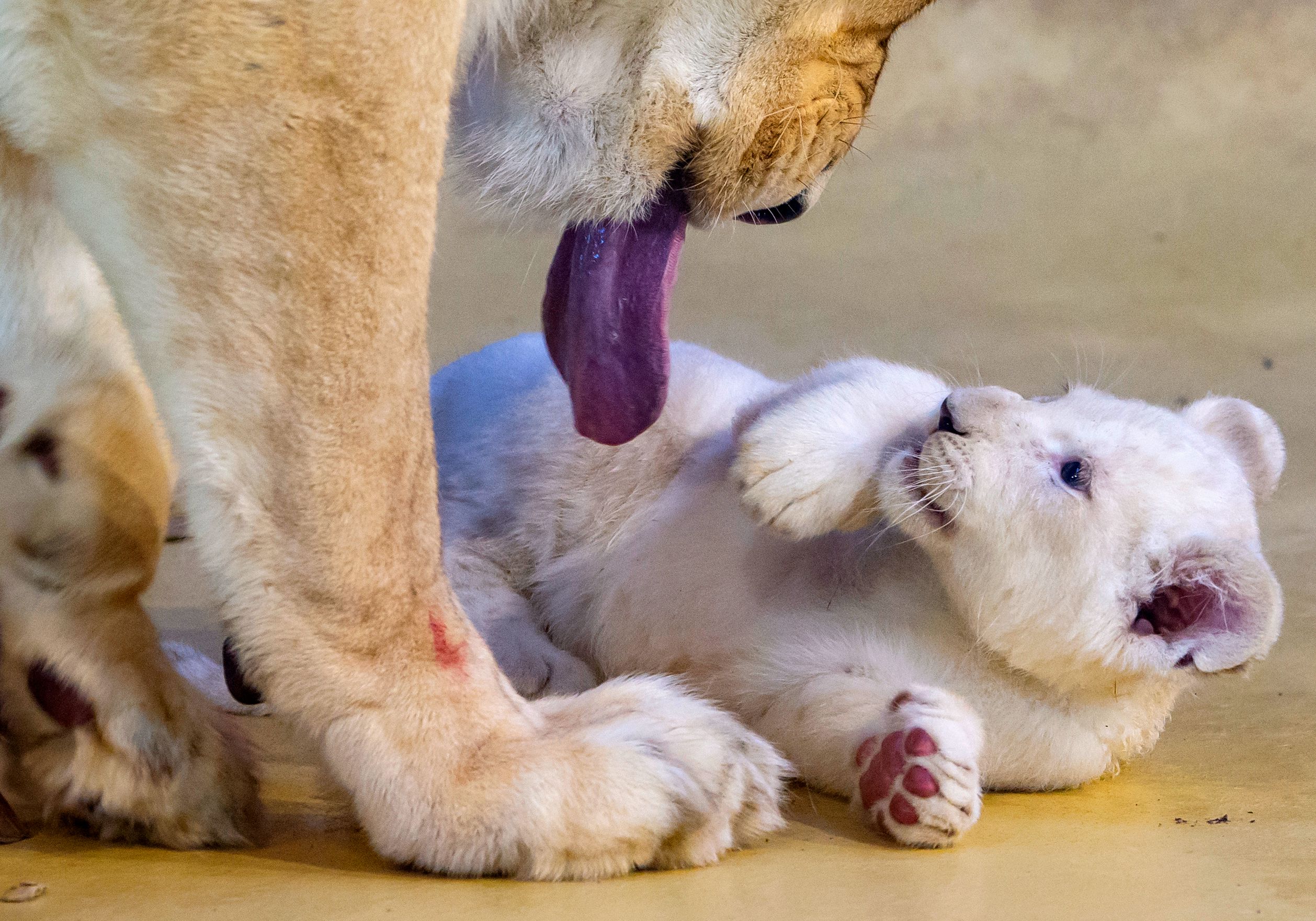 当地时间2020年1月15日,德国马德堡,当地动物园内,三只罕见的白色幼狮亮相,可爱模样惹人怜。这些狮子宝宝出生于去年11月11日。
