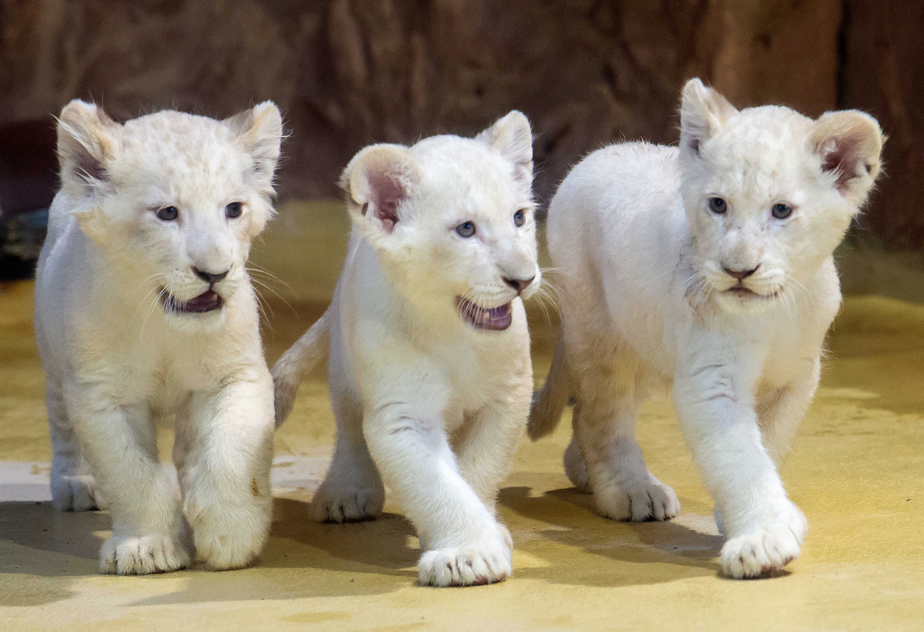 德国动物园小白狮三兄弟亮相 迈腿齐步走乖成小猫咪