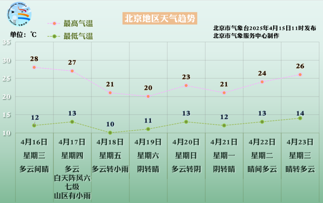 北京市气象台4月15日17时发布:今天夜间多云,南转北风二级左右,最低气温15℃;明天白天多云间晴,北转南风二三间四级,最高气温28℃。未来三天云量逐渐增多,昼夜温差较大,适时调整着装。