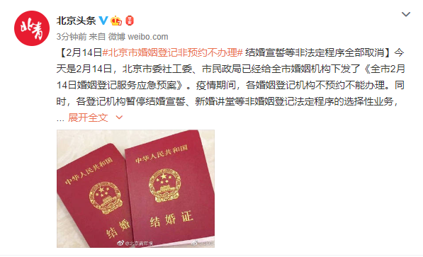 【2月14日#北京市婚姻登记非预约不办理# 结婚宣誓等非法定程序全部取消】今天是2月14日,北京市委社工委、市民政局已经给全市婚姻机构下发了《全市2月14日婚姻登记服务应急预案》。疫情期间,各婚姻登记机构不预约不能办理。同时,各登记机构暂停结婚宣誓、新婚讲堂等非婚姻登记法定程序的选择性业务,缩短新人滞留时间。