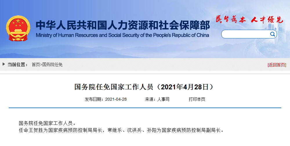 国务院任免国家工作人员:王贺胜任国家疾病预防控制局局长