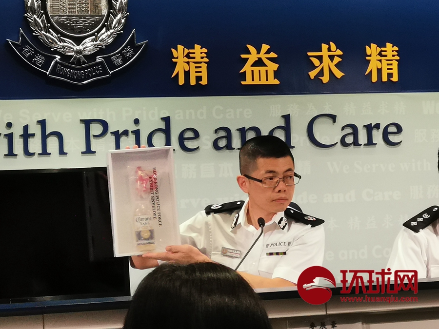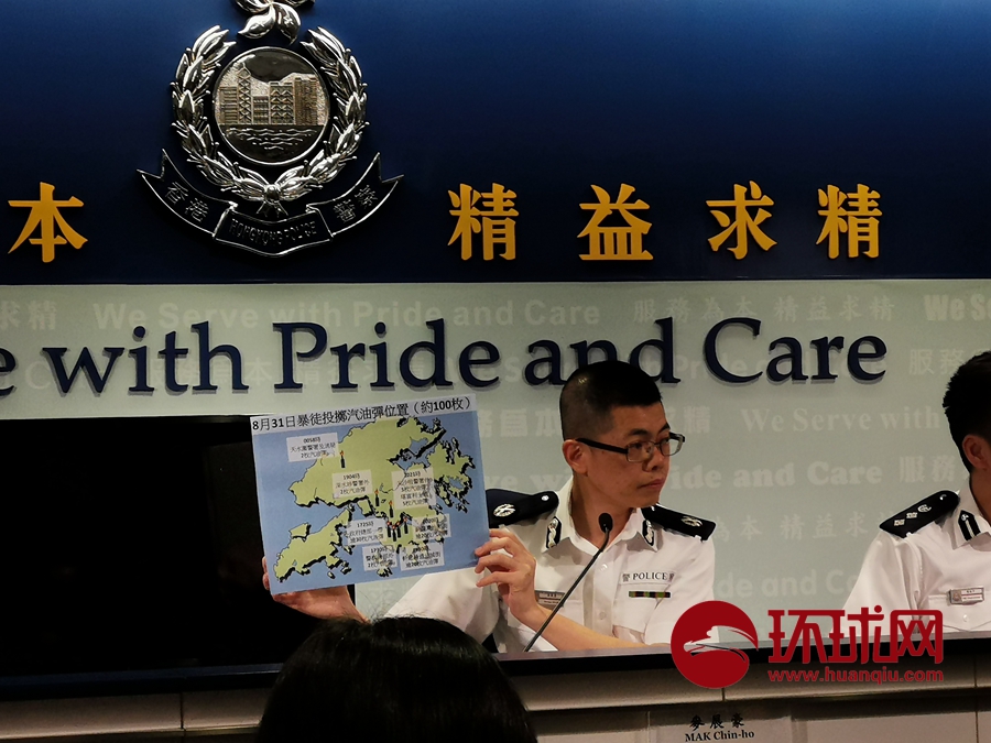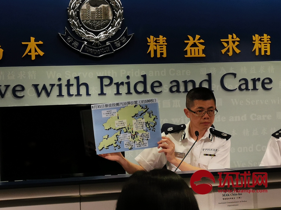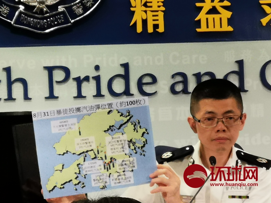 警务处助理处长(行动)麦展豪向媒体展示暴徒使用的汽油弹燃烧瓶。他表示在8月31日晚,全港范围内暴徒共使用至少100枚汽油弹发起袭击。他表示,如今暴徒使用的汽油弹燃烧得更持久,危害更大。环球时报-环球网赴香港特派记者杨升/摄
