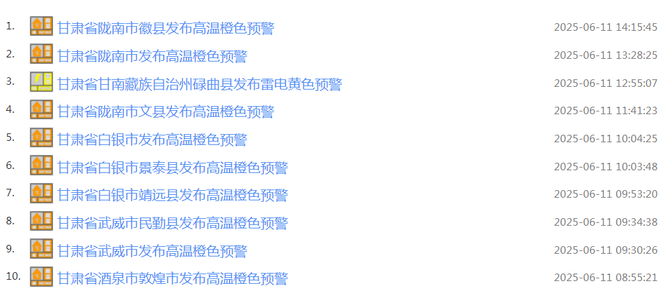 文县气象台2025年06月11日11时41分发布高温橙色预警信号:预计今天下午,我县临江、尖山、城关、石坊、尚德、玉垒、口头坝、碧口、范坝、中庙等部分乡镇最高气温将升至37℃以上。