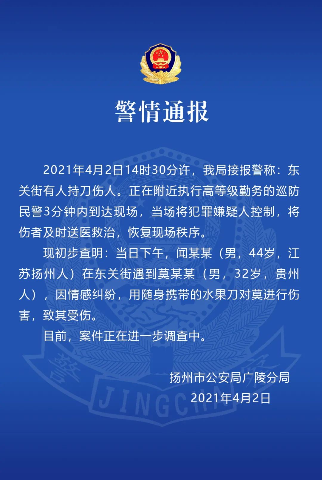 扬州市公安局广陵分局4月2日发布警情通报称,2021年4月2日14时30分许,我局接报警称:东关街有人持刀伤人。正在附近执行高等级勤务的巡防民警3分钟内到达现场,当场将犯罪嫌疑人控制,将伤者及时送医救治,恢复现场秩序。