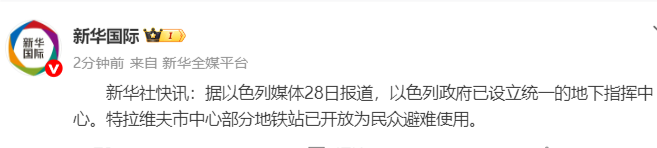新华社快讯:据以色列媒体28日报道,以色列政府已设立统一的地下指挥中心。特拉维夫市中心部分地铁站已开放为民众避难使用。