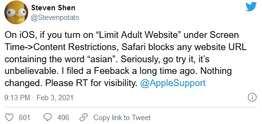 周四,iOS开发者Steven Shen在推特上声称,Screen Time内容限制部分下的 "限制成人网站"选项给任何试图通过Safari访问URL中包含 "亚洲人 "一词的网站的人带来了问题。