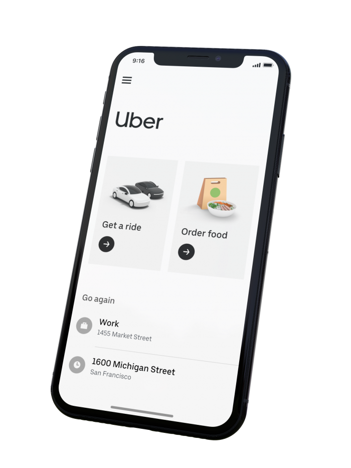 当用户打开Uber应用时将会看到两个选择框:get a ride(打车)、order food(订餐)。