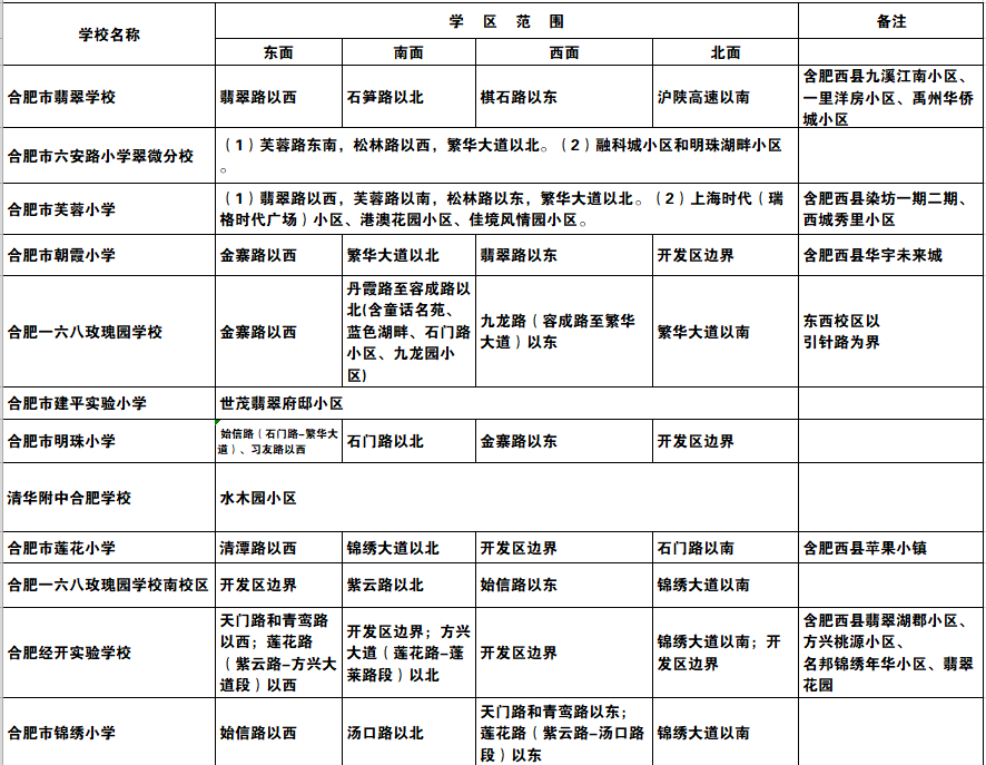 4.合肥市桂花园学校教育集团慧园校区:望江西路以南,西二环接集贤路以西,习友路以北,科学大道以东(不含保利香槟国际和文一名门首府)。