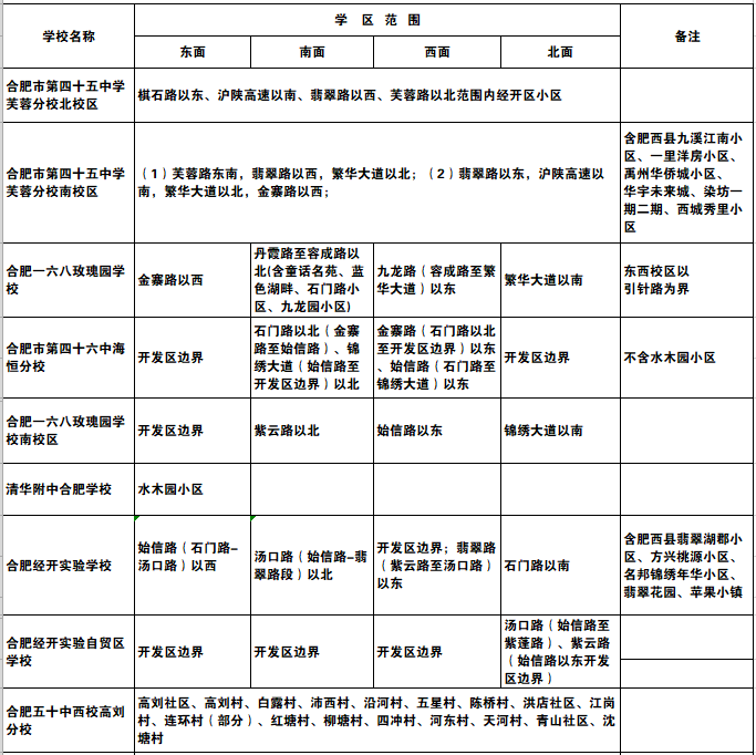 1.中国科大附中高新中学:长江西路以南,西二环路以西,望江西路以北,玉兰大道以东(含和一花园、环东小区高新区部分,不含烟厂宿舍小区)。