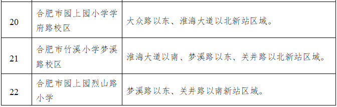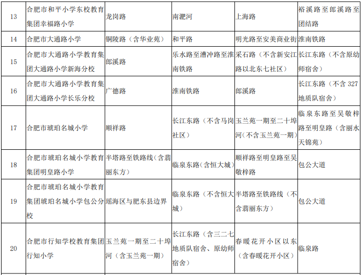 20.合肥实验学校教育集团滨湖校区: 包河大道以西,紫云路以北,庐州大道以东,锦绣大道以南。