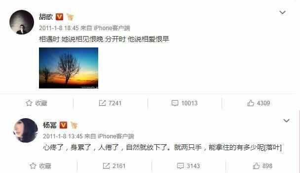 胡歌刚出道最开始参演的是聊斋剧,当时就和杨幂结缘了,在后来和杨幂参演仙剑三中正式与杨幂传出绯闻,在当时一个是刚刚红火的小鲜肉,一个是当红小花旦,男未婚女未嫁都还比较青涩,两人在剧中的CP感更是被粉丝纷纷叫好,两人在当时围脖也有过一起的互动,但后来好像胡歌妈妈不喜欢杨幂,只能无疾告终….
