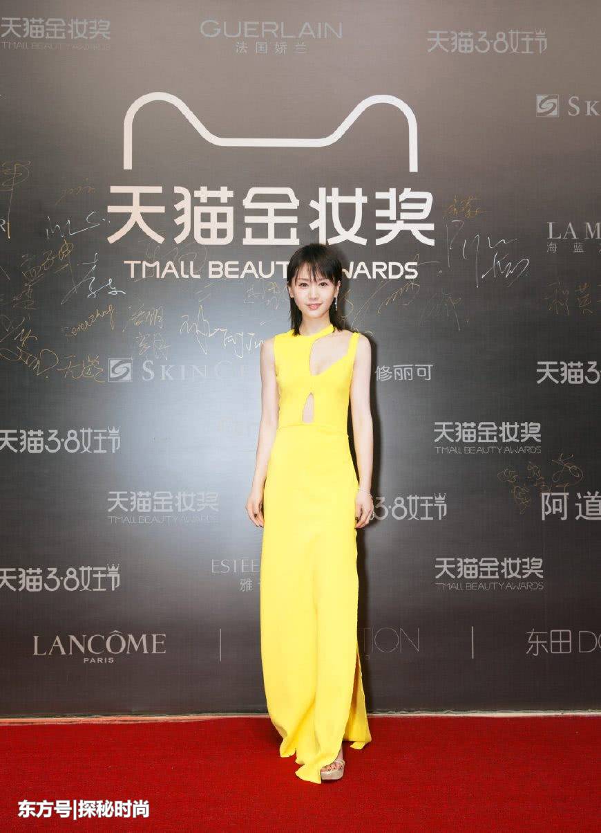 近日出席活动的王子文以一身露胃黄色连衣裙出镜。