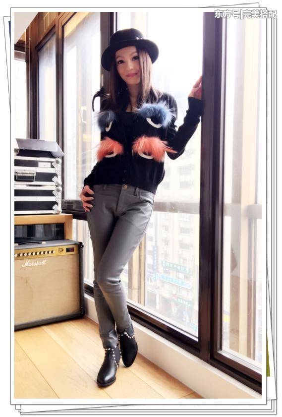 张韶涵可真是瘦啊!穿着一件黑色偏反光的裤子真的是一点也不胖,而且腿型真的特别好看呢,上身一件黑色的真是毛衣,毛衣上的毛绒绒眼睛设计真的很咔呀依呢。