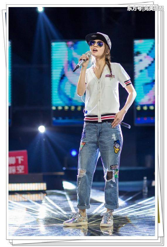 张韶涵戴着白色的棒球帽,穿着一件白色的针织短袖搭配一条蓝色的破洞牛仔裤,一身搭配随性舒适,看上去很舒适活力呢,戴着一副墨镜在深情的献唱真的十分迷人呢。