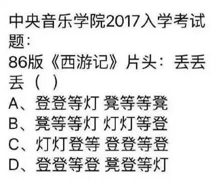 这个版本的孙悟空至今还无人超越。当主题曲《云宫迅音》的声音deng deng deng deng ~一出来时立刻就能让人联想到这是电视剧西游记中的音乐。可见这首曲和这部剧的的影响之深。据说这段音乐还被选入过中央音乐学院的考试入选题。题目见图,大家也可以来做一下此题,在评论区中留下你认为的答案。正确答案最后公布哦。