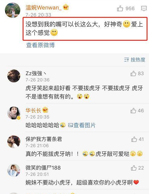 对此网友们也是发表了自己的看法,很多网友也是纷纷表示:千万别拔!的确温婉的虎牙非常的可爱,如果因为一两个人的不满意就拔了真是太可惜了。但是温婉却把焦点放在了自己的嘴上,称没有想到自己的嘴可以长这么大,好神奇,爱上了这个感觉!温婉也是够可爱的,别人都在关注她的虎牙,温婉自己却爱上了自己的大嘴!