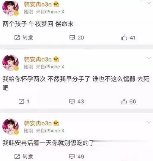 除了整容,韩安冉的私生活也非常混乱,分手后撕男友,还打胎两次,在和男友吵架的时候连发微博,还说:两个孩子,午夜梦回偿命来。
