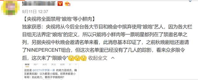 此前,有传闻称央视发布了“限娘令”引发关注。什么是“限娘令”呢?据悉央视将在今后所有的节目禁止所有的“娘炮”艺人登台,虽然出了这样的规定,但是谁也不能很清晰的分辨出哪些艺人是娘炮,所有也只有拿与娘炮挨得最近的小鲜肉群体下手了。很可能在以后央视的节目画面中,你看到不到小鲜肉明星的登台。