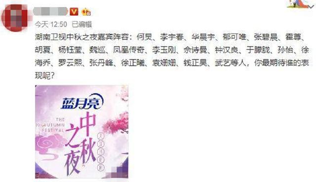 央视公布中秋节晚会明星阵容后,网上也曝出了一份湖南卫视中秋节晚会的明星名单。看了央视中秋晚会明星阵容,再看看湖南卫视的,小编发现根本不是一个档次的。